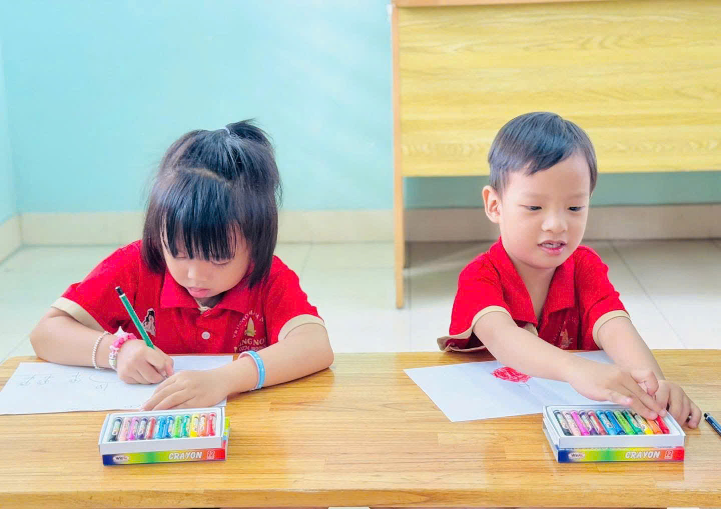 🖍️ Các bé khối Mầm, Chồi, Lá đã tự tin thể hiện ý tưởng của mình qua những bức tranh vẽ theo vật mẫu trên giấy khổ A4, A3, kết hợp màu sáp rực rỡ để tạo nên những tác phẩm đầy sắc màu, sinh động và sáng tạo.