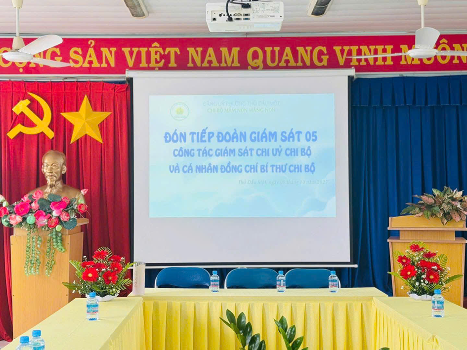 Thực hiện Quyết định số 05-QĐ/UBKTĐU ngày 10/9/2025 của Ủy ban Kiểm tra Đảng ủy phường Thủ Dầu Một, vào trưa ngày 09/10/2025, Chi bộ Trường Mầm non Măng Non đã trang trọng đón tiếp đoàn giám sát đến làm việc tại đơn vị.