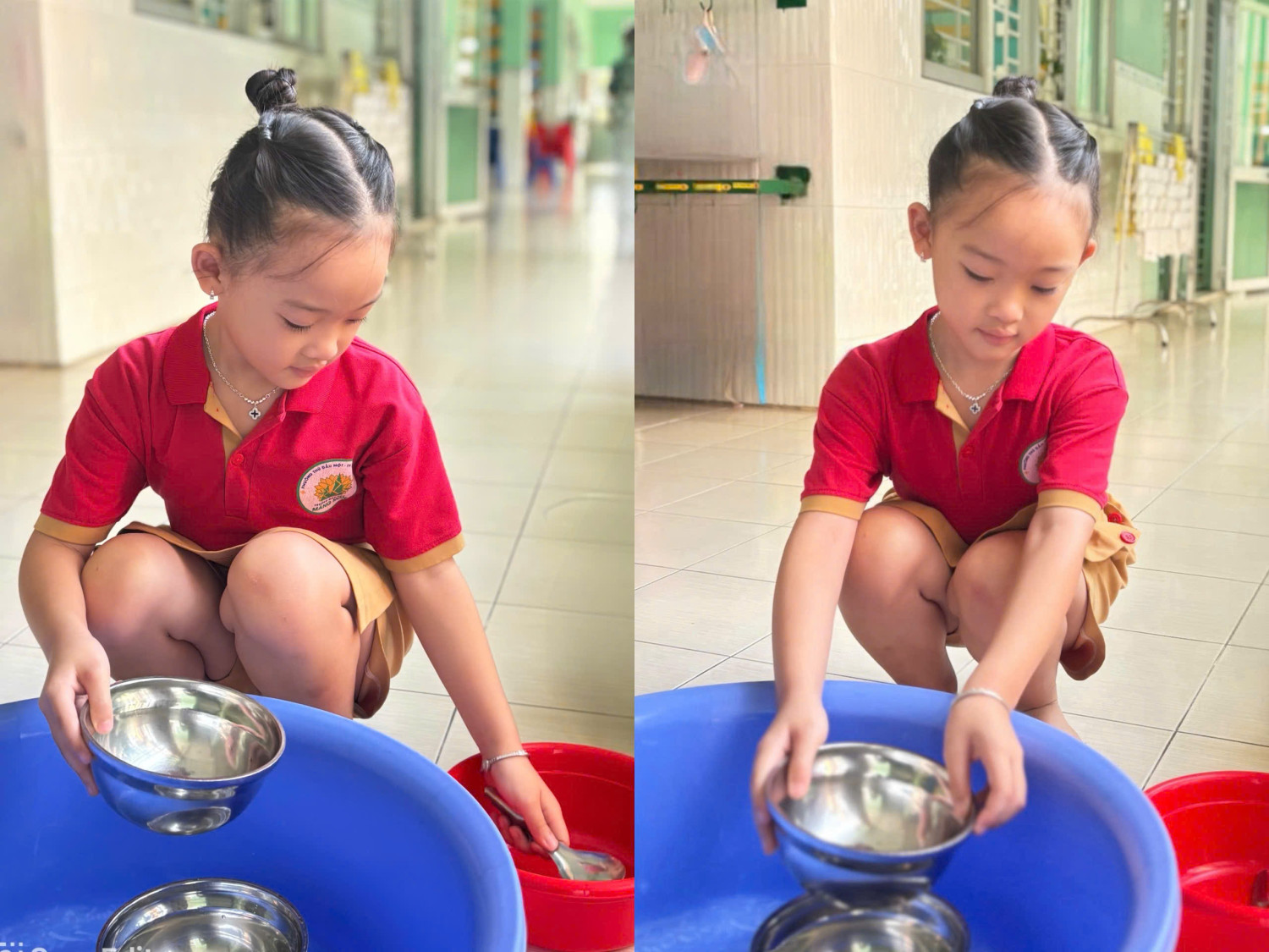 - Trẻ biết tự thu dọn chén, muỗng nhẹ nhàng, đúng nơi quy định.